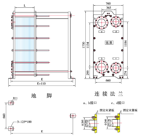 框架包括一個固定壓緊板和一個活動壓緊板,由上導桿與下導桿支承,在另‘端有一支柱。壓制成的波紋板片懸掛在兩板之間的上導桿上,移動活動壓緊板將板片組壓緊,再用一組夾緊螺柱將固定壓緊板和活動壓緊板夾緊至一定尺寸。兩種介質經固定(或活動)壓緊板上法蘭孔流入由波紋板片組成的各自通道,熱交換后介質再由固定(或活動)壓緊板上的法蘭孔流出。同定壓緊板、活動壓緊板、支柱及導桿均為低碳鋼。考慮到用戶的多種使用要求,框架設計有多種型式,主要有雙支撐框架式和常用的落地式等,也可根據用戶的要求更改框架的型式。